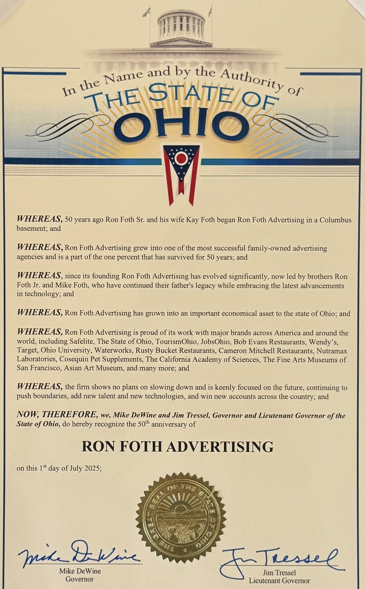 …recognizing the 50th anniversary of Ron Foth Advertising. Thank you Governor DeWine and Lt. Governor Tressel. We’ve been Ohio proud from the beginning.
